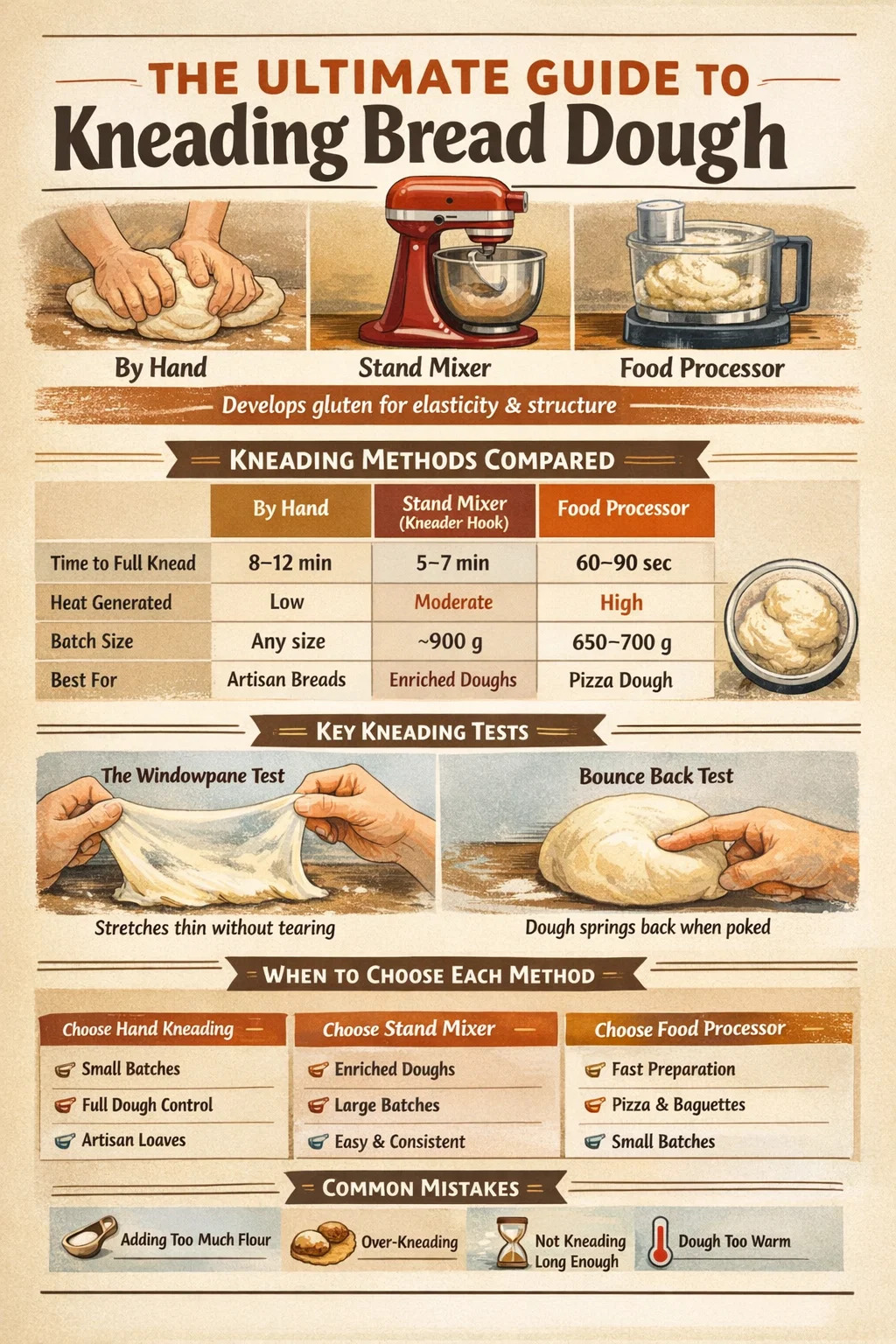 Za većinu tijesta za kruh, kuka za miješanje mješalice koja radi na brzini 2 razvit će puni gluten za 5-7 minuta. Neka gušća tijesta, poput tijesta za pecivo ili perece na 56–60% hidratacije, možda će trebati 8 minuta. Pretjerano miješenje pravi je rizik pri velikim brzinama: predugo pokretanje miksera na brzini 4 ili višoj može zagrijati tijesto zbog trenja, oslabiti mrežu glutena i proizvesti pretjerano ljepljivu, degradiranu teksturu.
