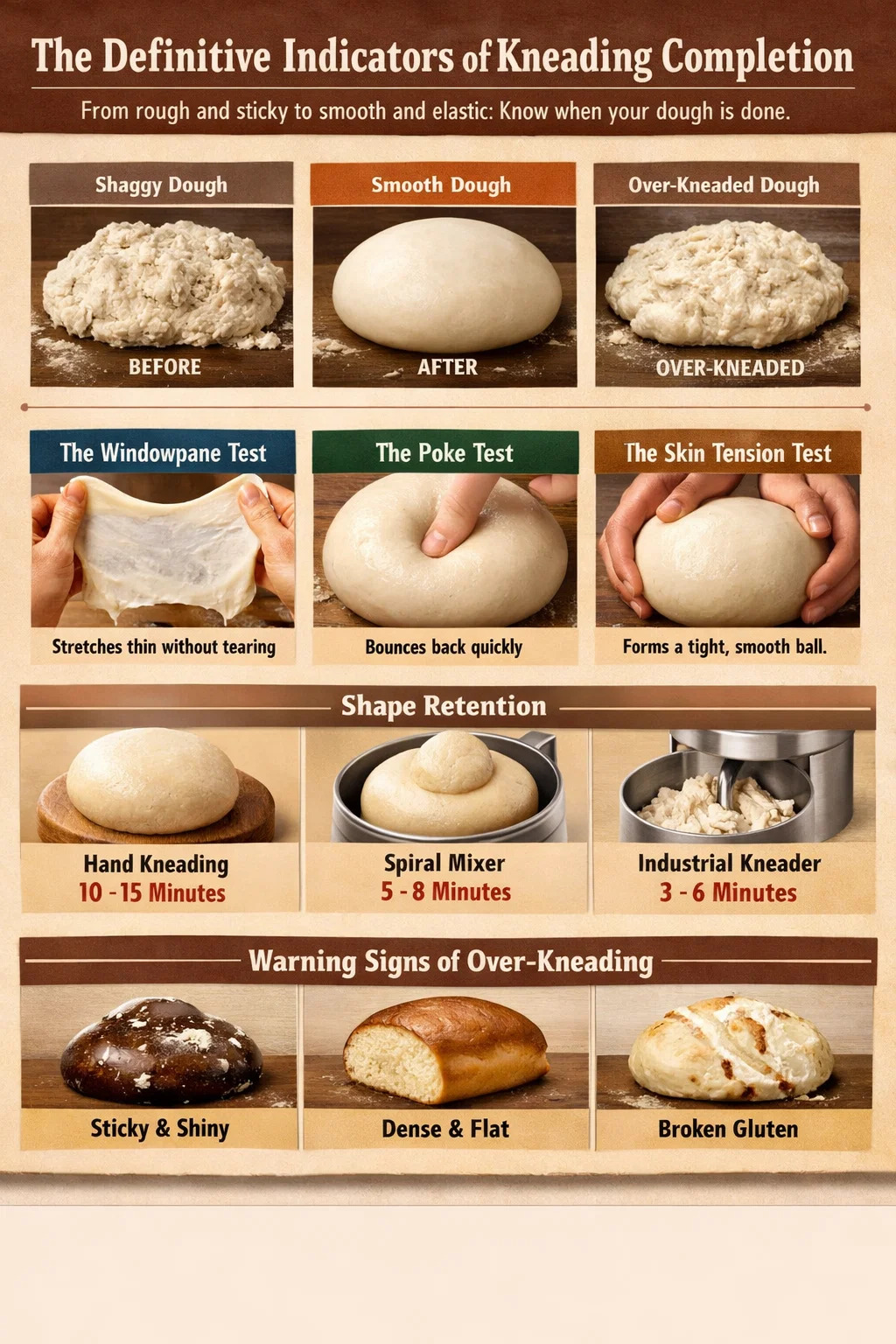 Umjesto da se oslanjate isključivo na mjerač vremena, koji može biti netočan zbog vlage ili sadržaja proteina brašna, upotrijebite ove fizičke referentne vrijednosti da provjerite stanje vašeg mijesio materijala.