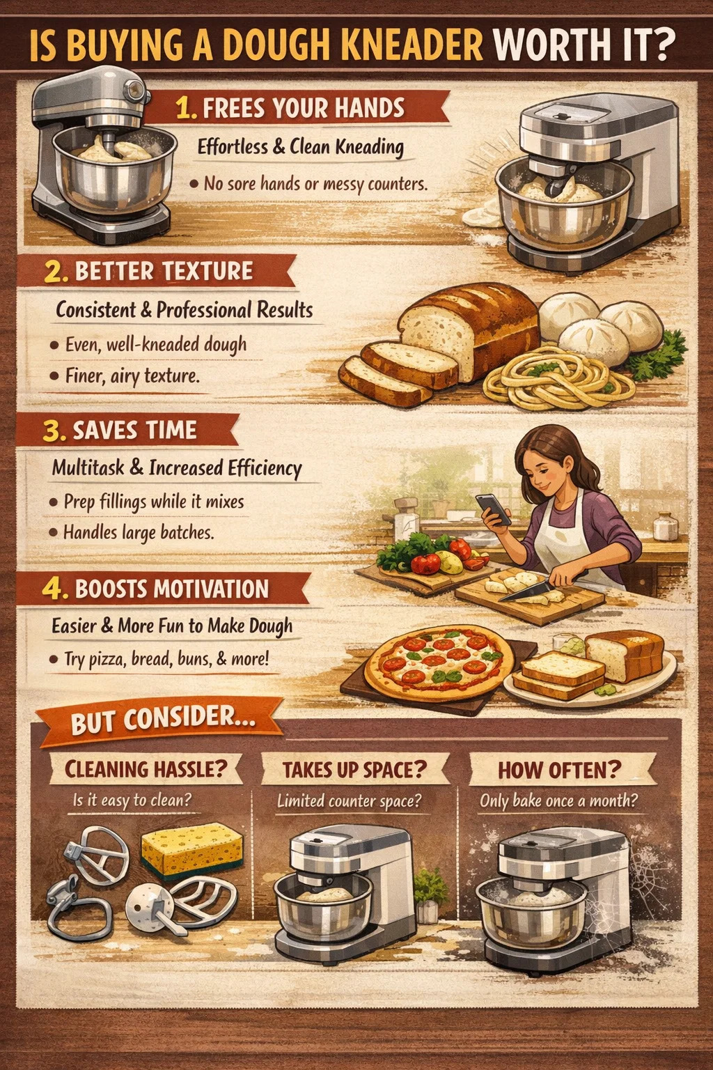 Bez napora: Miješenje tijesta je fizički zahtjevno, pogotovo ako želite postići onu "prozorsku" ili žvakaću teksturu. Bolovi u rukama i leđima su česti. Sa strojem samo ulijete vodu i brašno i pritisnete gumb.