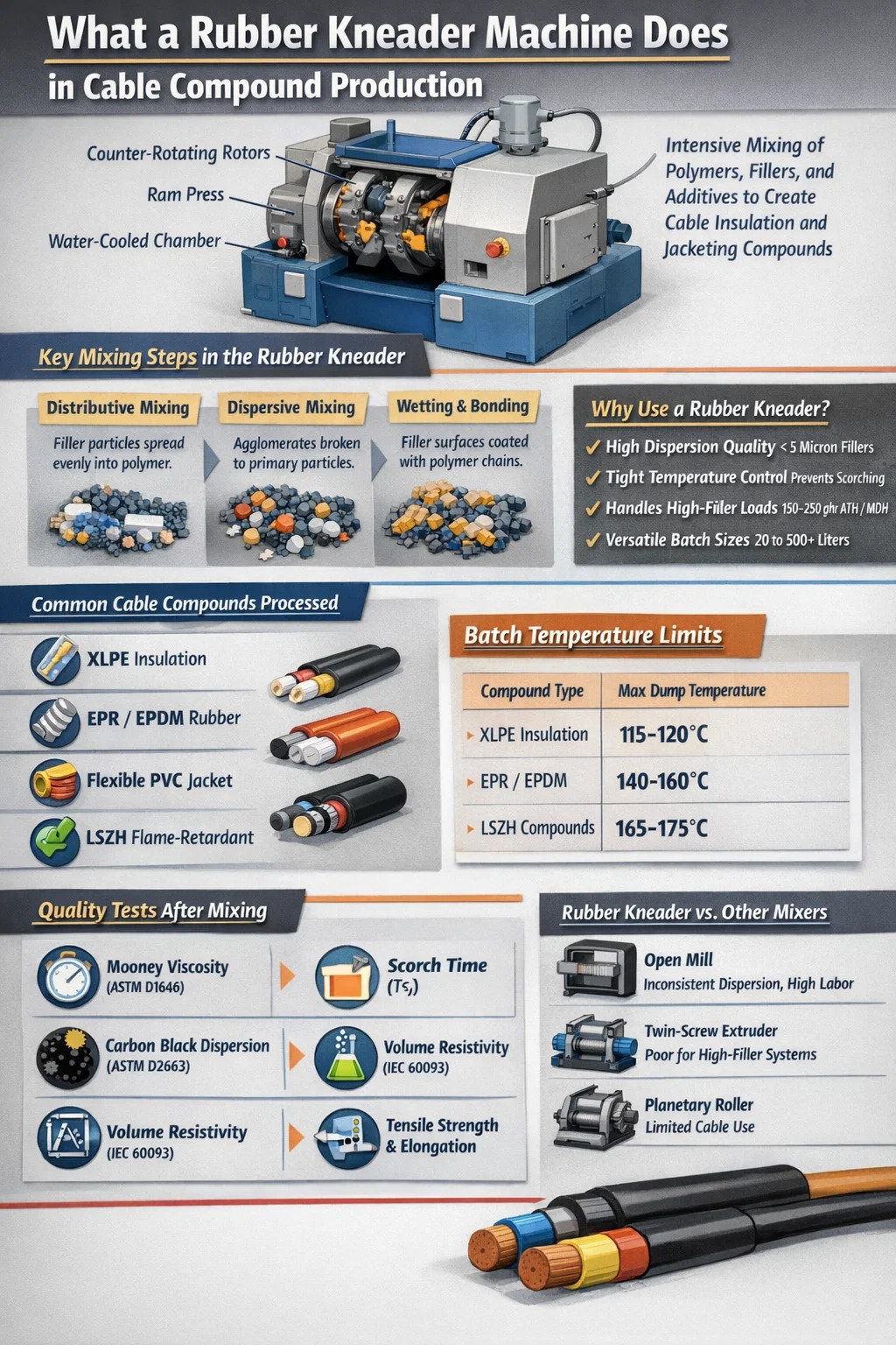 Stroj za gnječenje gume—također nazvan interni mikser ili disperzijska gnječilica—srednja je oprema za miješanje koja se koristi za transformaciju sirove gume ili polimernih osnovnih materijala u gotove spojeve za kabele spremne za ekstruziju. U proizvodnji kabela, smjesa mora ispunjavati stroge električne, mehaničke i toplinske zahtjeve. Gumena gnječilica to postiže primjenom intenzivnog smičnog naprezanja, kompresije i topline kako bi se pomiješali elastomeri, punila, plastifikatori, antioksidansi, usporivači plamena i sredstva za vulkanizaciju u jednoliku masu koja se može obraditi.