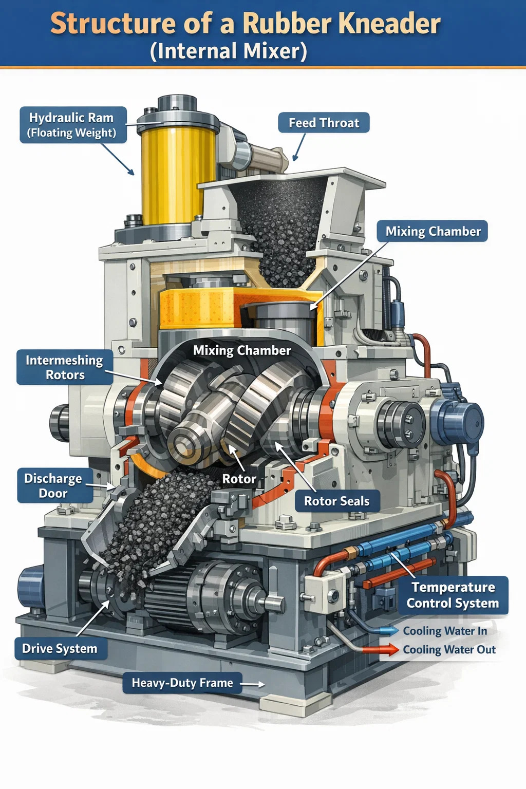 Struktura jezgre gumene gnječilice sastoji se od šest primarnih sustava: komore za miješanje, rotora, hidrauličkog cilindra (plutajući uteg), mehanizma vrata za pražnjenje, sustava za kontrolu temperature i pogonskog sustava. Svaki od njih ima posebnu mehaničku ulogu, a razumijevanje njihove interakcije otkriva zašto su interni gnječilice postale industrijski standard za gumene smjese u proizvodnji guma, brtvila, crijeva i proizvoda od tehničke gume.