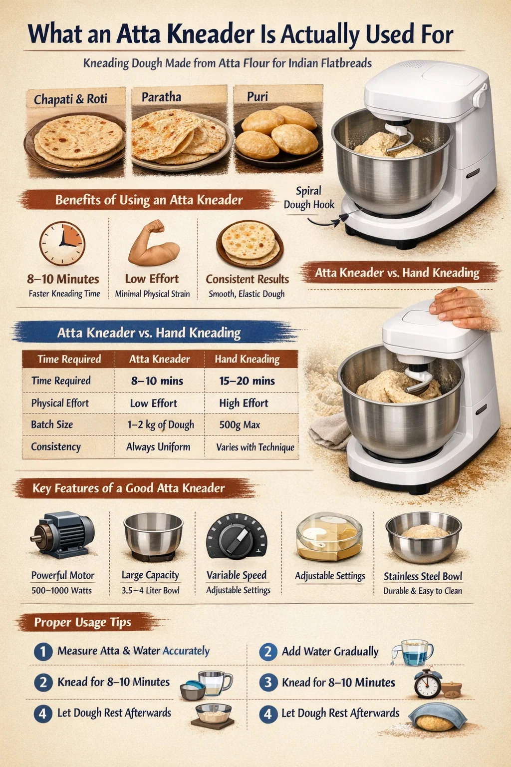 Kritična točka je da je atta — kao brašno od cjelovitog zrna pšenice s većim sadržajem vlakana od rafiniranog brašna — gušća i otpornija na hidrataciju. Mjesilica napravljena za attu je kalibrirana da podnese ovu gustoću bez pregrijavanja motora ili naprezanja mehanizma.