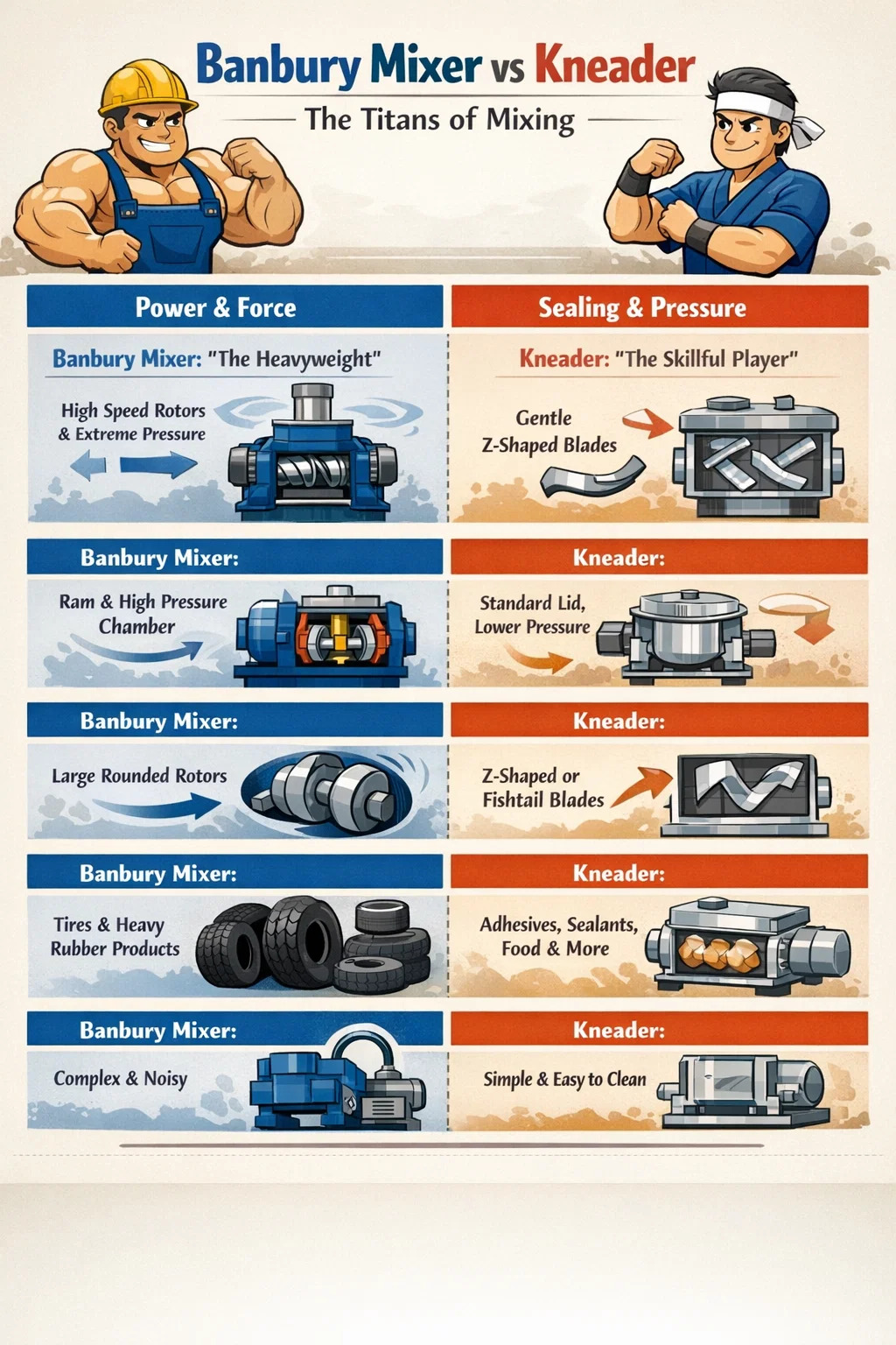 U svijetu prerade gume i plastike, **Banbury mikseri i gnječilice** su poput dva moćnika različitih osobnosti. Dok oba mogu ravnomjerno miješati viskozne sirovine, značajno se razlikuju u svojim metodama rada i snazi.